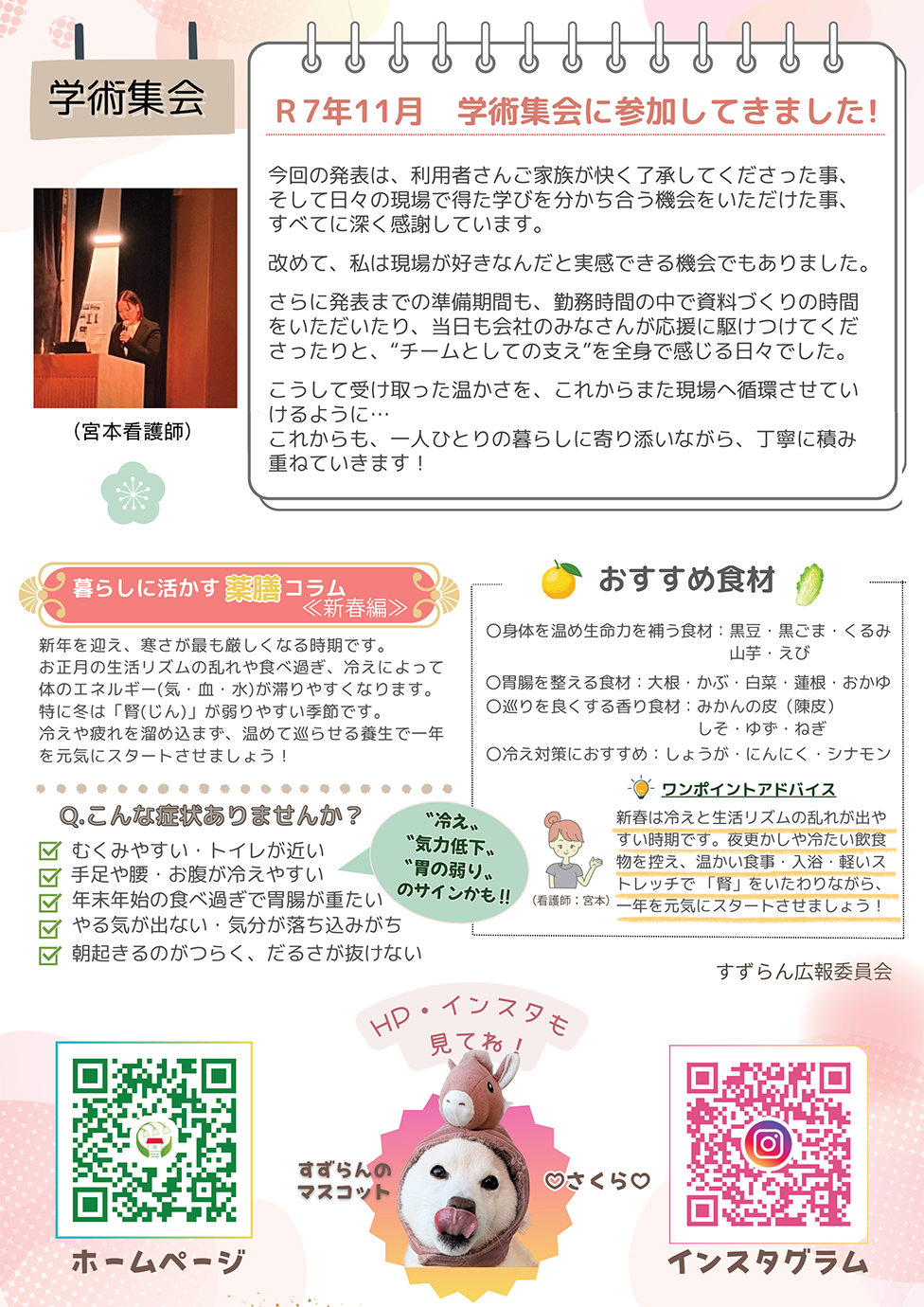 今号では、看護師スタッフが学術集会で発表した様子や、毎日の暮らしにちょっと役立つ薬膳コラムもご紹介しています。